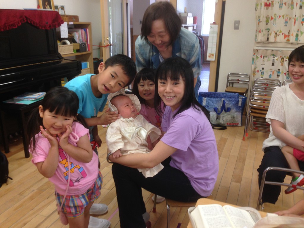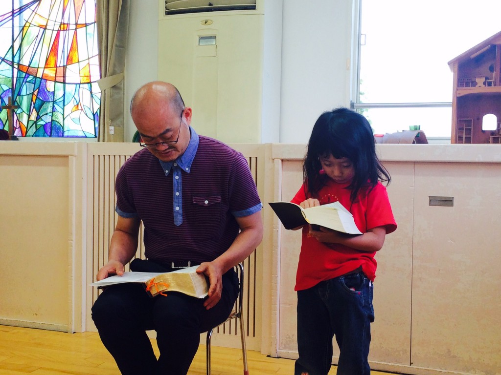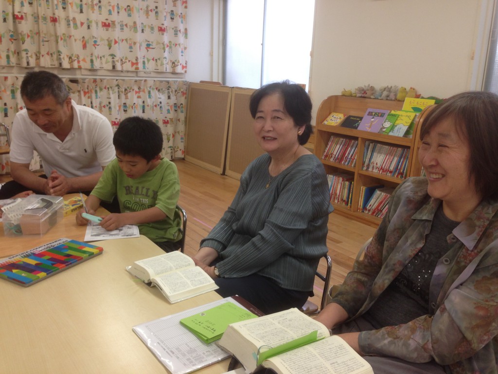 聖書の交わり れいはい前 はじめの祈りは栗原さん 誕生日祝い、おのさん。 こども…