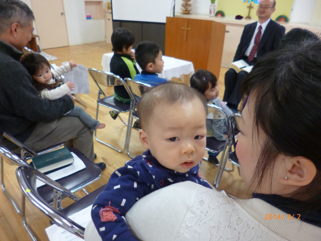 礼拝前の様子。 こども聖句前に精神集中。 今日のお花。 礼拝前、聖…