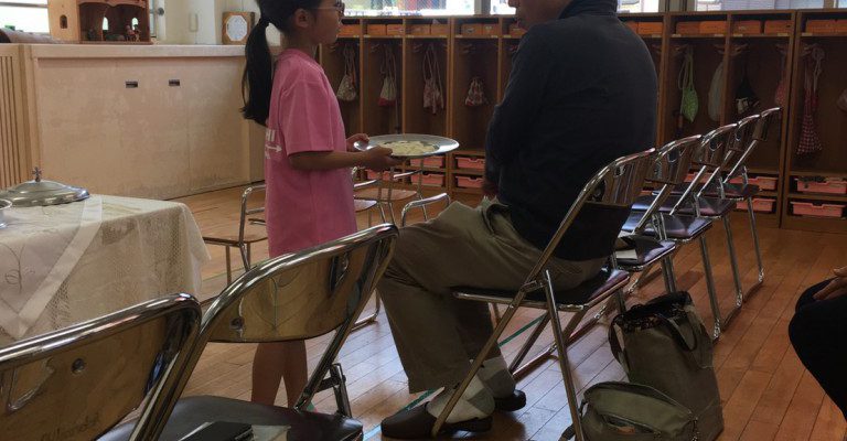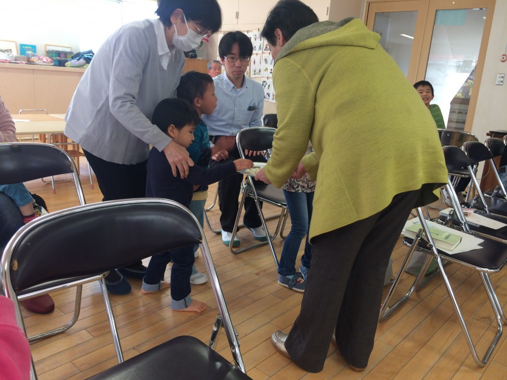 礼拝前。お客さん、いらっしゃーい。 子ども聖句はうたちゃん。