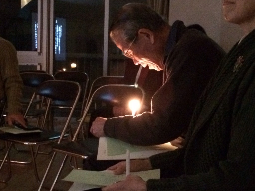 キャンドルサービス直前 始まりました。だんだん増えて、最後は44名+犬1頭になりました。 キャロリン…